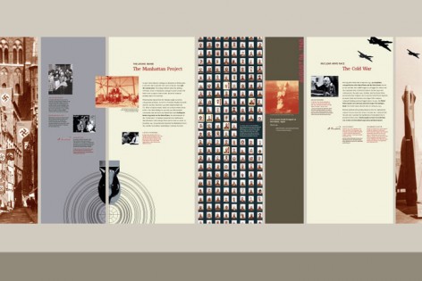 The Life and Times sections were unified by a wall-based timeline constructed from large printed panels. Graphic systems of panel width, type, and colour established a clear hierarchy which allowed for multiple levels of reading and created a visual rhythm which carried the viewer forward through Einstein's life story. -