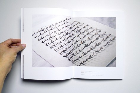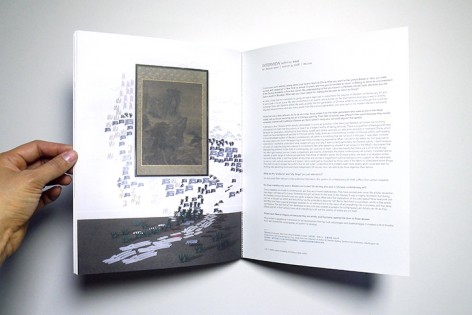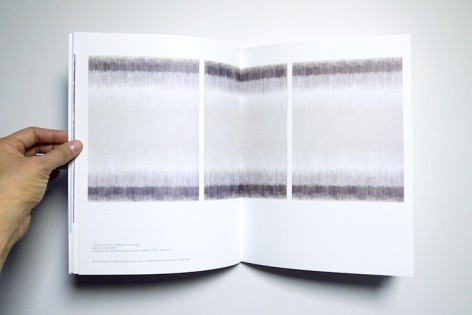 Taking the title of the exhibition as its inspiration, a visual representation of slippage and movement in both type and image evokes the elusive nature of the present moment. Twelve artwork images were composited and distilled into three continuous bands of pure color representing the three "currents" of the exhibition, which were then wrapped around the exterior and extended onto interior flaps which in turn open to reveal the original images from which the composite was constructed. In this way the 12 artists featured in "Here+Now" could be represented equally, and as part of a continuum of art-making in time and place, with the added feature of surprise and discovery for the reader in the opening of the book. -