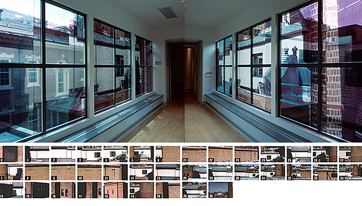 Two installation views of the south-facing windows plus source image index of bridge exterior