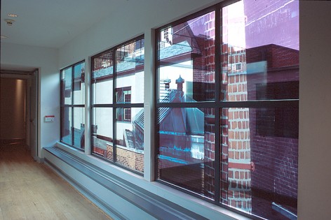 Composite views of the bridge exterior as seen from campus rooftops were constructed and digitally printed on 16 large sheets of static film. Applied to the interior windows, the translucent images map an alternate spatial reality. Through this enveloping yet discontinuous skin, multiple readings of the site are revealed as frame, photograph, shadow, reflection and view become one.
