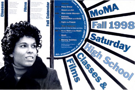 This small poster was distributed to local high schools as a way to increase teen participation in MoMA’s Film and Lecture Series. A still from featured film Shaft (shown below, cropped) provides the structure for the poster in a lighthearted approach which considers the age and interests of the target audience.