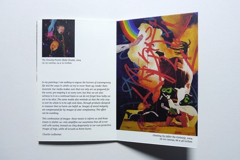 Charlie Ledbetter’s gripping onslaught of imagery brings us back to Earth, a place where rainbows take on sinister new meaning. Boldly layered iconographies are an immediate and emotional response to contemporary life and times. -