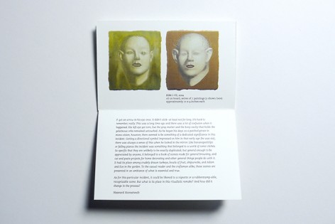Each spread in the catalogue contained a statement or piece of writing by the featured artist, while the press release contained a brief description of each artist's work (examples below).