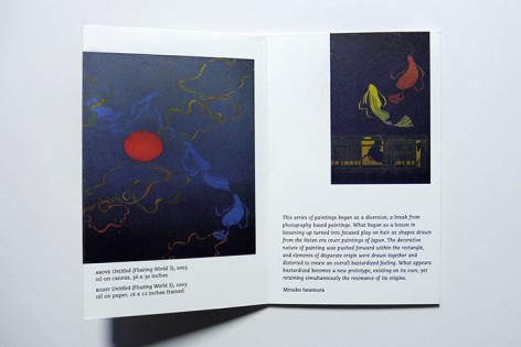 Minako Iwamura’s floating worlds are unabashedly beautiful skyscapes in which enigmatic and ancient shapes twist and billow. What is in fact the disembodied hair of Heian court ladies takes on its own figurative quality, lyrical and sensual, yet comical as well.